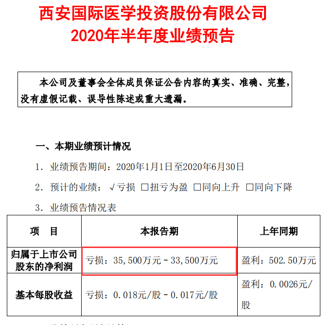 根据国际医药2020年半年度业绩预测,上市公司股东应占净利润损失为3.35亿元至3.55亿元,下降7164.68%。在业绩变动原因方面,据公布,由于COVID-19肺炎的影响,报告期内Xi安高科医院股份有限公司和商洛国际医疗中心医院股份有限公司的医疗收入同比下降,实现利润相应下降。
