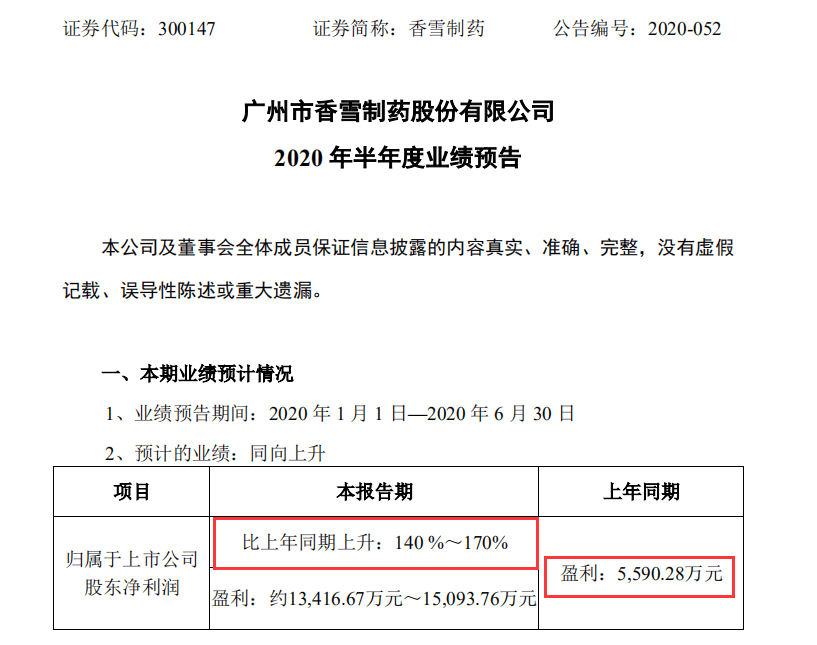 6月5日,香雪海药业发布了业绩预测。香雪药业预计,2020年1-6月上市公司股东应占净利润为1.34亿至1.51亿元,同比增长140%-170%,中药行业净利润平均增长率为-10.60%。