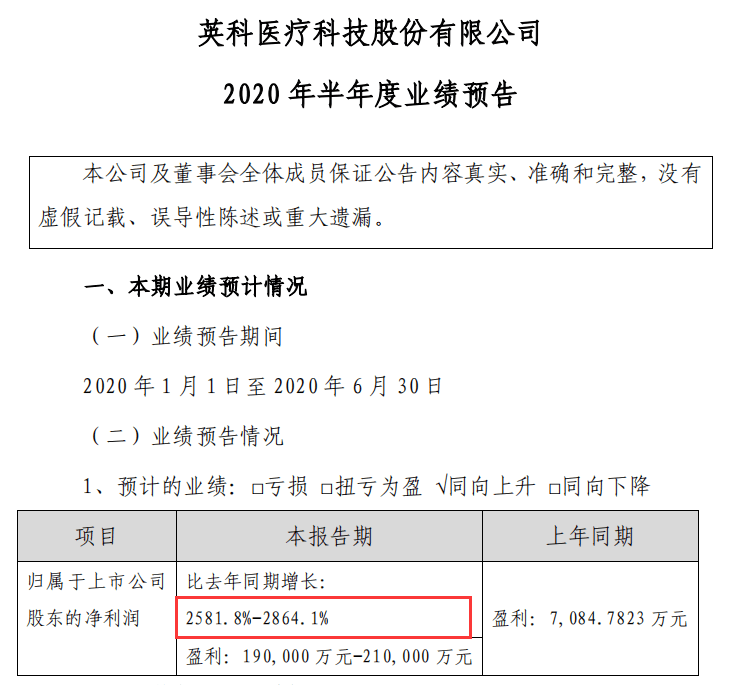 7月10日,盈科医疗发布的2020年半年度业绩预测显示,截至2020年6月30日,公司净利润为19-21亿元,去年同期利润为7084万元,同比增长2581.8-2864.1%。